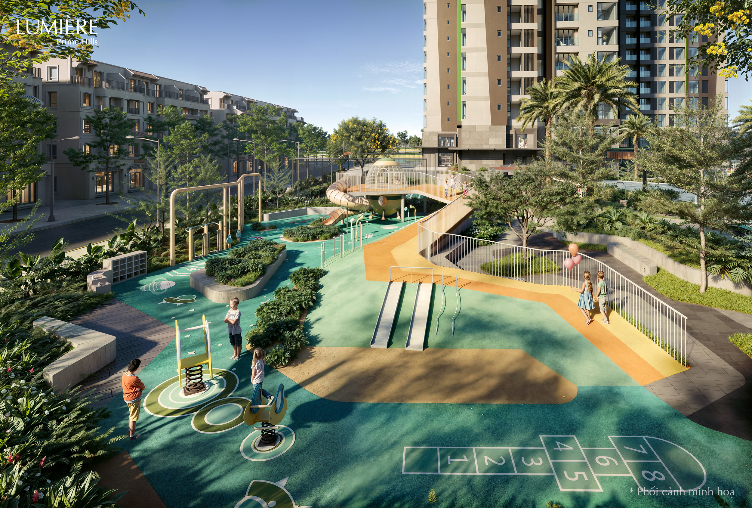 Mặt bằng tiện ích và cảnh quan của Lumière Prime Hills mang đậm chất nghỉ dưỡng với các mảng xanh đa tầng và hệ thống bể bơi đẳng cấp.